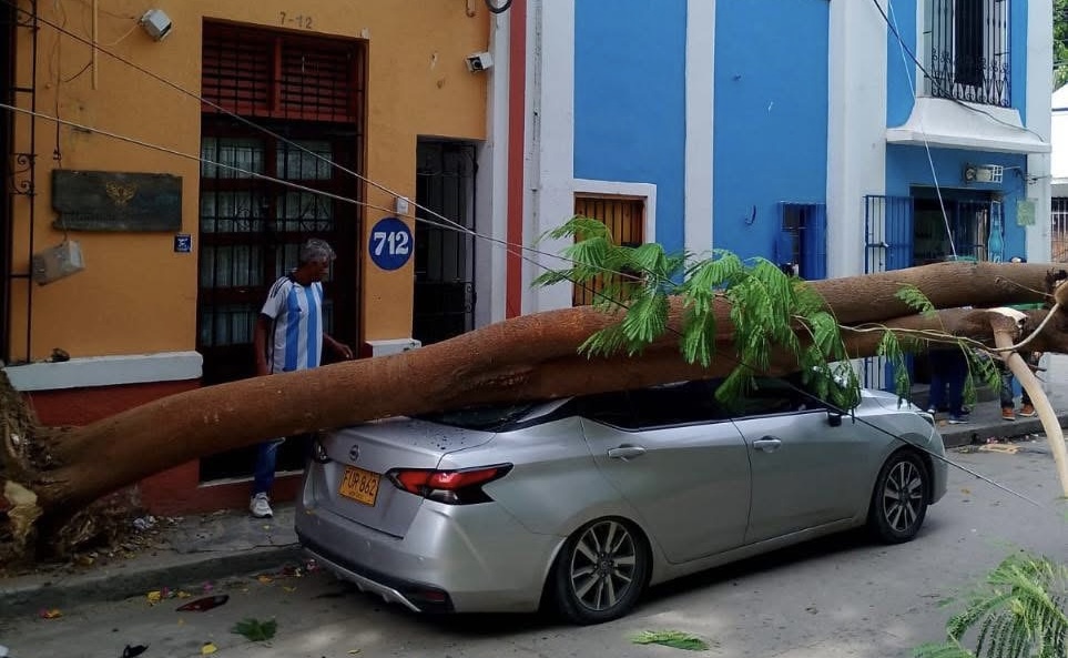 En la calle 16 con carrera 7, en pleno centro de Santa Marta, un vehículo resultó gravemente afectado tras el desplome de un árbol. Comerciantes y residentes exigieron a las autoridades medidas urgentes, ya que este tipo de situaciones ponen en riesgo la vida de transeúntes y conductores.