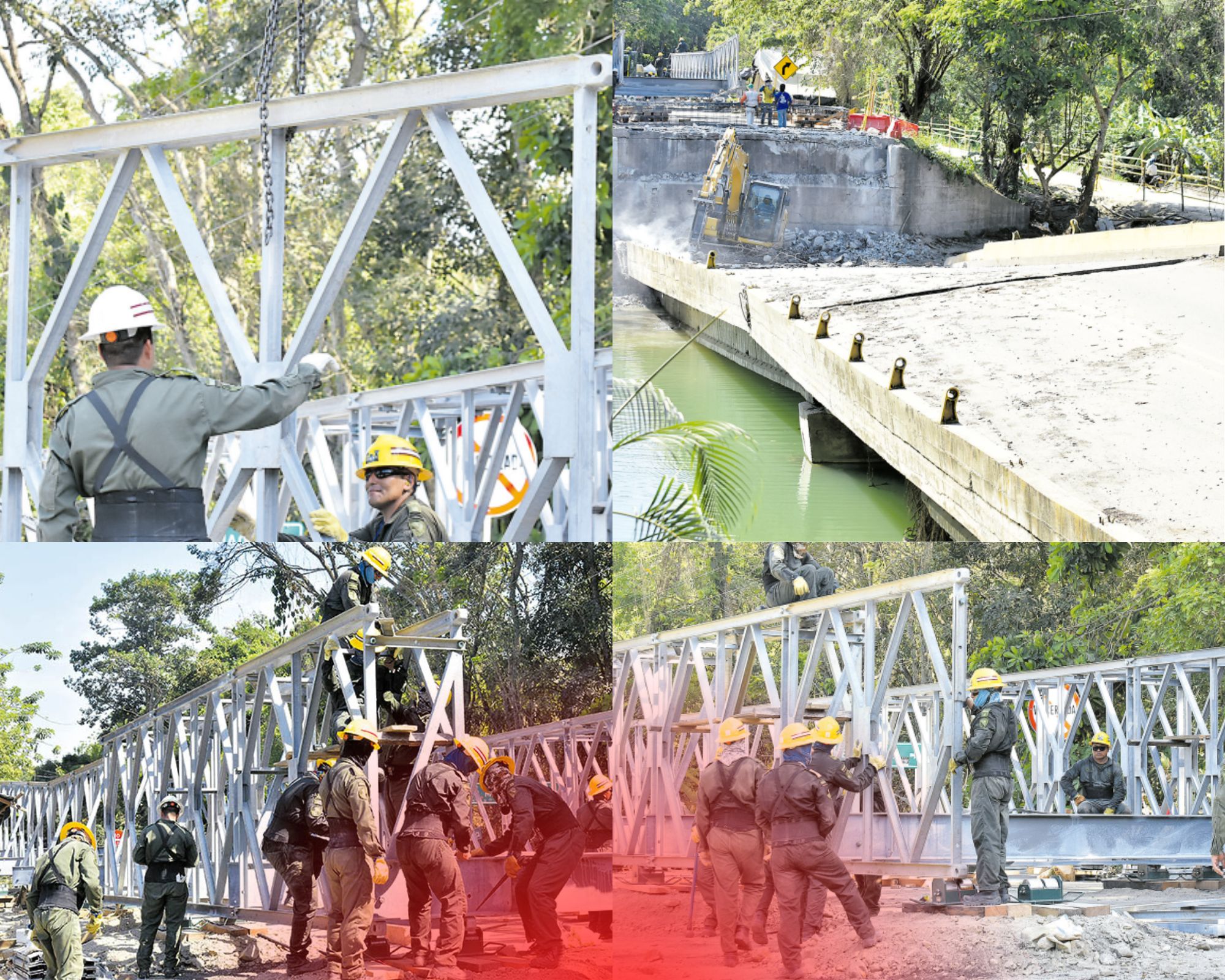 La estructura metálica, de aproximadamente 60 metros de longitud y 20 de ancho, está siendo armada por personal especializado del Ejército Nacional de Colombia, incluidos ingenieros militares provenientes de la base de Tolemaida, junto a operarios del Batallón de Ingenieros y equipos técnicos del Instituto Nacional de Vías y el Ministerio de Transporte.