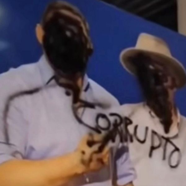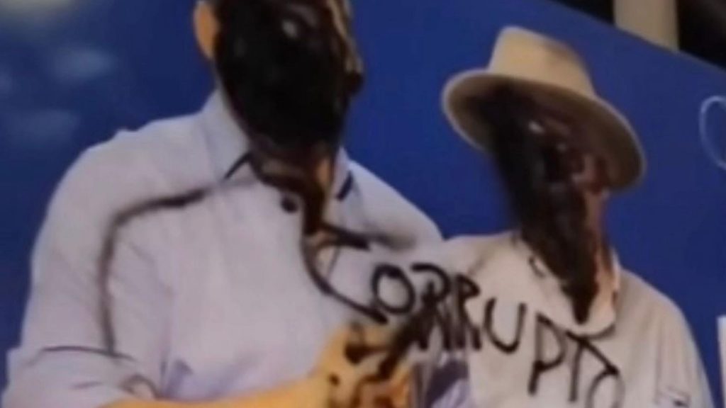 Una intervención vandálica ejecutada en Santa Marta que cubrió de pintura negra los rostros del expresidente Uribe y Honorio Henríquez, dejó escrita esta palabra...