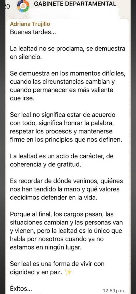Adriana Trujillo, una de las figuras más cercanas al caicedismo, compartió un texto en el que defendía la lealtad como un valor que “se demuestra en silencio” y en los momentos difíciles, haciendo énfasis en permanecer cuando otros deciden irse.