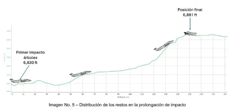 Según el informe técnico, la trayectoria observada sugiere que el avión no logró superar el relieve montañoso antes del impacto, en circunstancias que aún están bajo investigación.