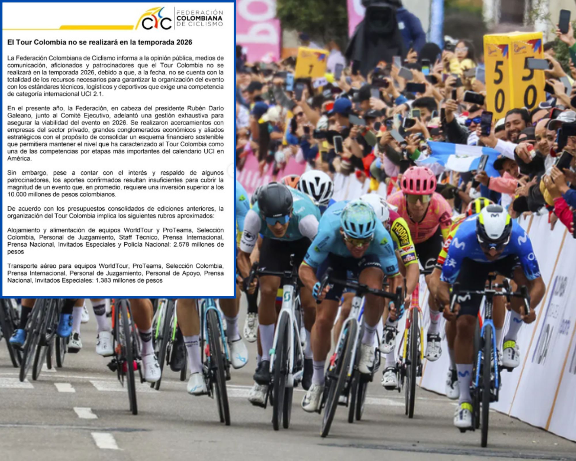 “El Tour Colombia no se realizará en la temporada 2026, debido a que, a la fecha, no se cuenta con la totalidad de los recursos necesarios para garantizar la organización del evento con los estándares técnicos, logísticos y deportivos que exige una competencia de categoría internacional UCI 2.1”, indicó la Federación.