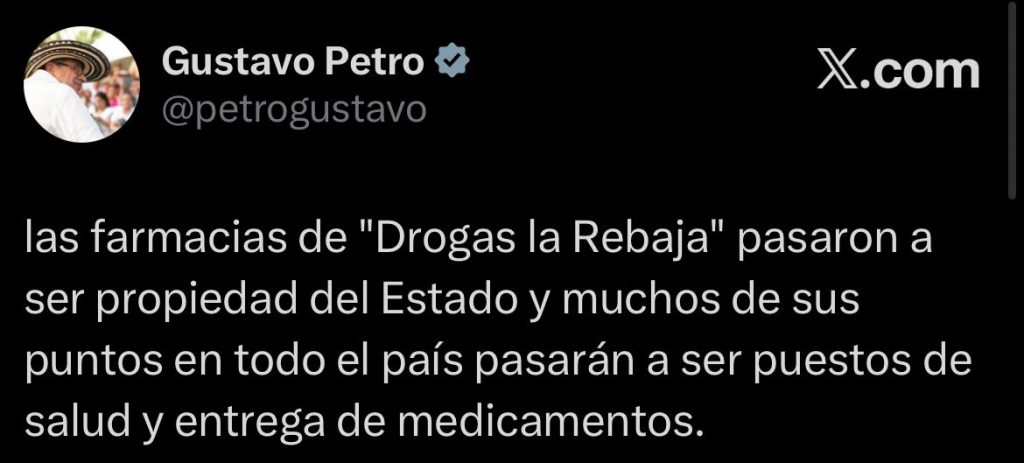 El presidente de Colombia, Gustavo Petro, anunció que las droguerías de Drogas La Rebaja comenzarán a funcionar también como puntos de atención médica y entrega de medicamentos en todo el país.