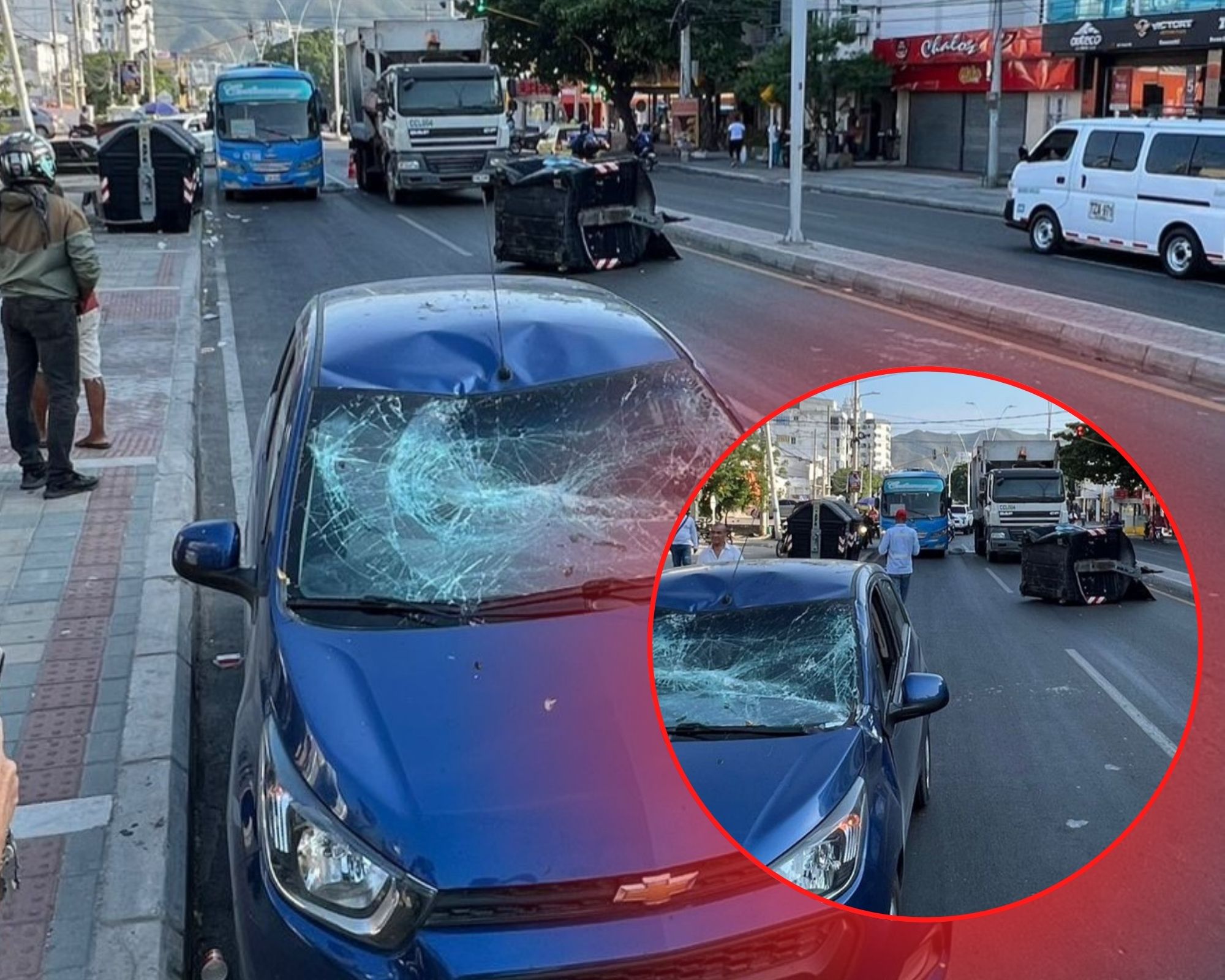 De acuerdo con lo ocurrido, el camión de la empresa de aseo circulaba con el contenedor elevado, lo que generó que, al avanzar, impactara un cable que atravesaba la vía. La tensión provocó que el elemento se desprendiera y cayera directamente sobre un automóvil de color azul que transitaba por la zona.