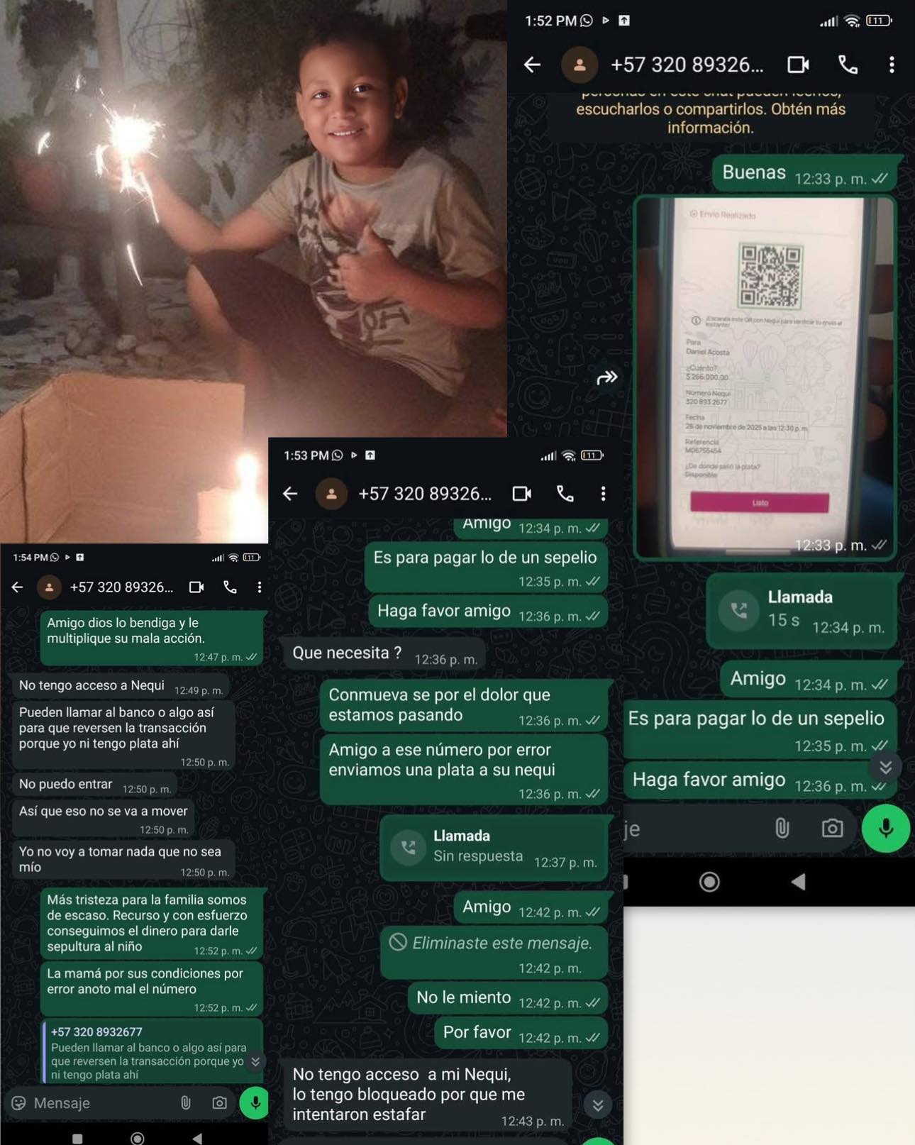 Según relataron los familiares, allegados al menor realizaron una transferencia de $270.000 pesos para apoyar los gastos del sepelio; sin embargo, el dinero habría sido enviado por error a un número equivocado. Pese a los intentos de contactar a la persona que recibió los recursos para explicarle la situación, la familia asegura que no obtuvo respuesta y que, posteriormente, fueron bloqueados.