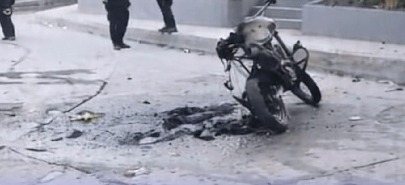 En medio de los disturbios, una motocicleta de la Policía fue incinerada por los involucrados.