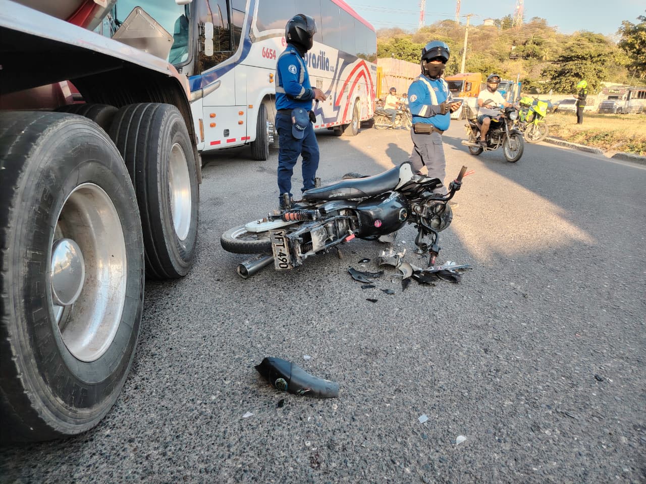 Según la información conocida hasta el momento, el conductor del vehículo de carga pesada asegura haber sentido un golpe repentino mientras salía de la instalación de la empresa Bavaria al tiempo que la motocicleta terminó tendida sobre la calzada con daños materiales.