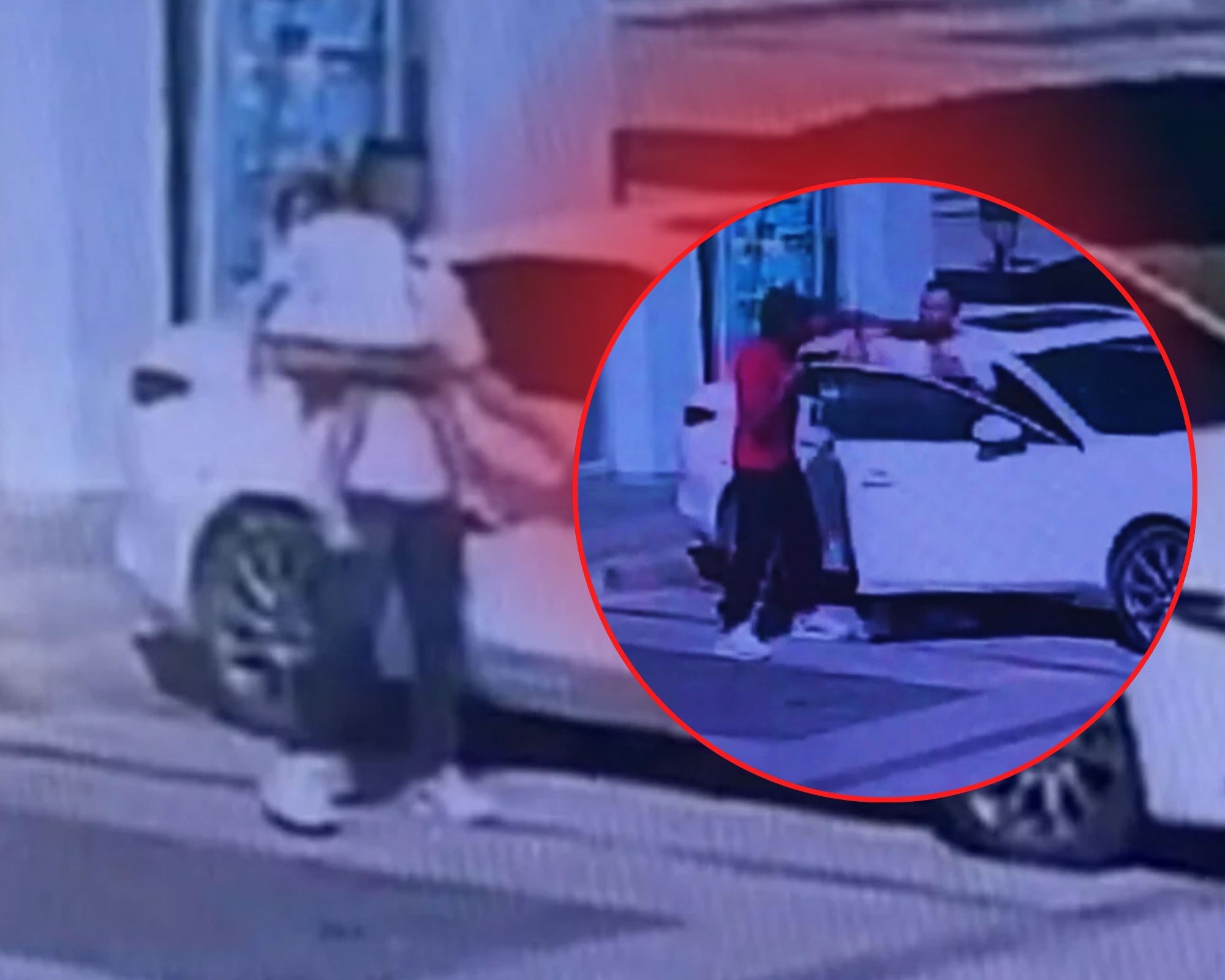 Minutos después aparece el hombre cargando a su hija en brazos mientras se dirige hacia su vehículo.El padre alcanza a sentar a la menor en el asiento del carro cuando el delincuente se acerca rápidamente y lo intercepta, en ese instante, el sujeto saca un arma de fuego y apunta directamente al hombre para obligarlo a entregar sus pertenencias.