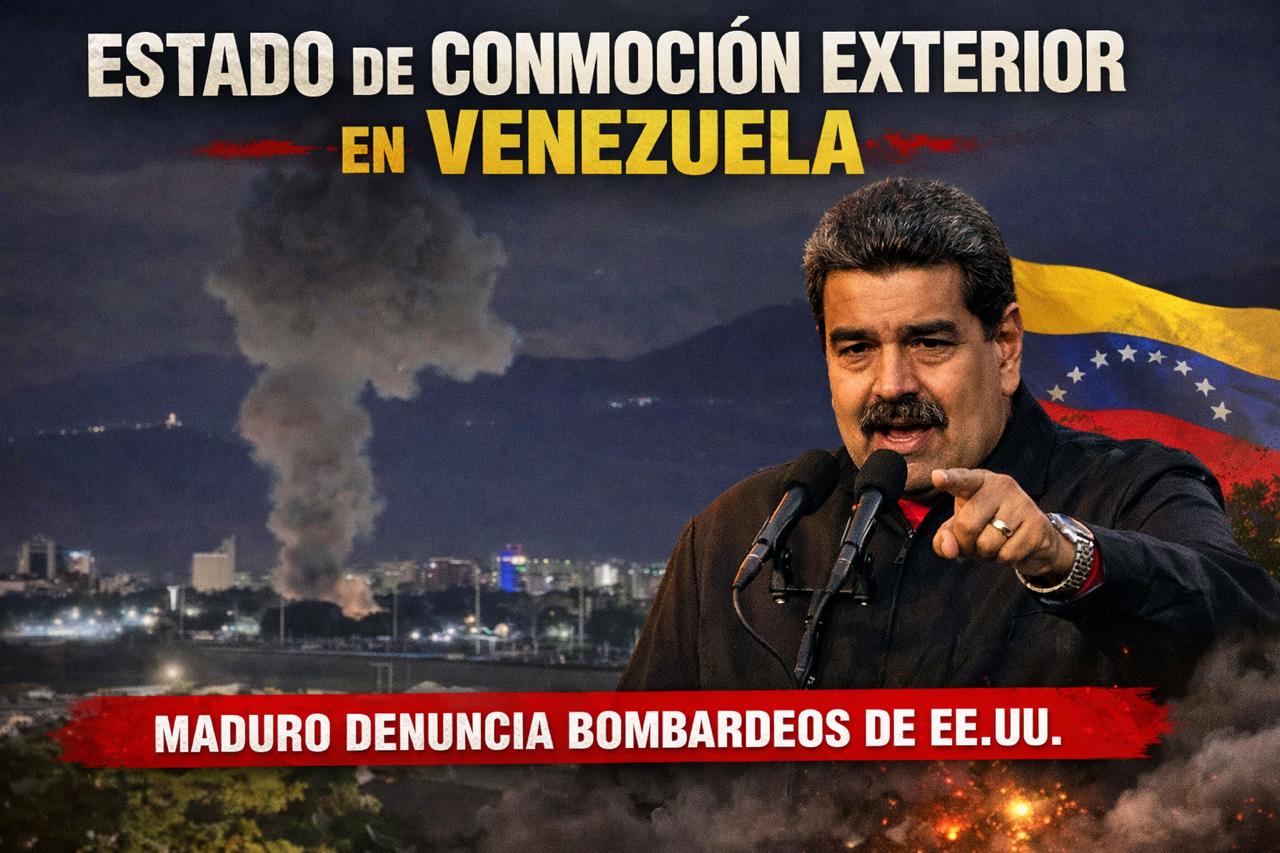 El Gobierno de Venezuela declaró este sábado el estado de Conmoción Exterior en todo el territorio nacional, tras una serie de explosiones reportadas durante la madrugada en Caracas y en zonas estratégicas del país, hechos que el régimen de Nicolás Maduro atribuye a bombardeos ejecutados por Estados Unidos.