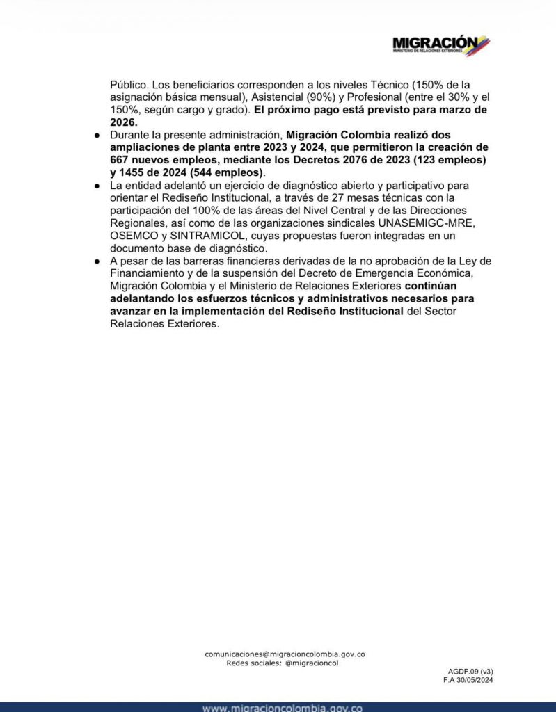 El conflicto sindical está relacionado con reclamos sobre condiciones laborales y el rediseño institucional de la entidad. Migración Colombia afirmó que ha cumplido parcialmente los acuerdos pactados y reiteró su disposición al diálogo, mientras aerolíneas como Avianca expresaron preocupación por las afectaciones a los pasajeros.