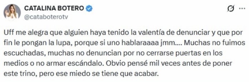 La noticia provocó reacciones en la industria mediática, destacando la del periodista Catalina Botero, quien recordó que muchas mujeres han enfrentado este tipo de situaciones sin ser escuchadas. “Uff, me alegra que alguien haya tenido la valentía de denunciar… porque si uno hablara… jmm”, escribió en su cuenta de X, añadiendo que el miedo a represalias ha sido un obstáculo para denunciar.