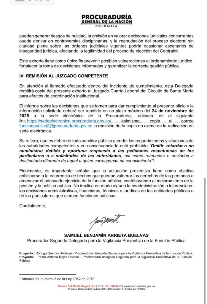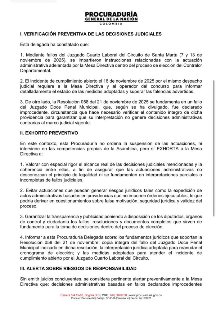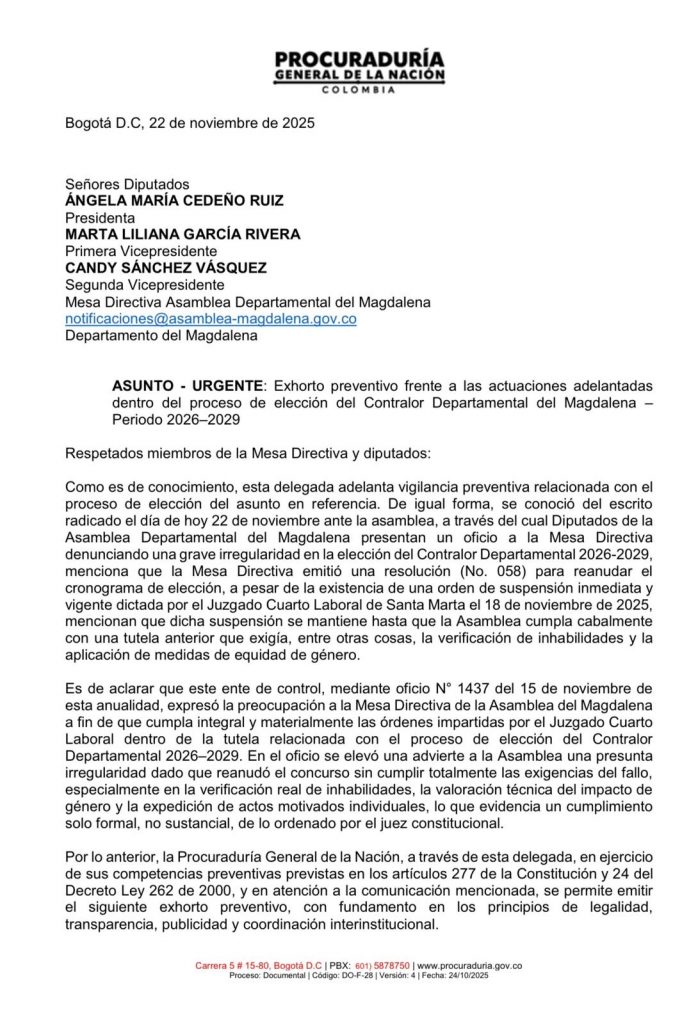 La Procuraduría General de la Nación emitió este sábado un exhorto urgente a la Mesa Directiva de la Asamblea del Magdalena, tras recibir denuncias de diputados sobre la emisión de la Resolución 058, con la cual se pretendía reanudar el proceso de elección del Contralor 2026–2029. Según el ente de control, esta reanudación se estaría realizando pese a que existe una orden de suspensión inmediata y vigente emitida por el Juzgado Cuarto Laboral el pasado 18 de noviembre.