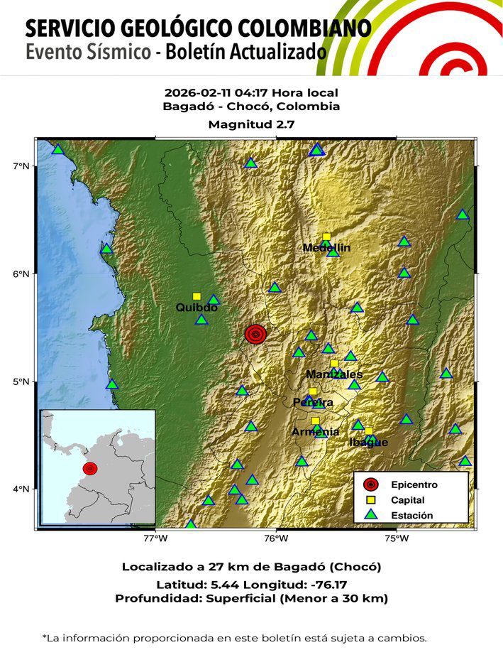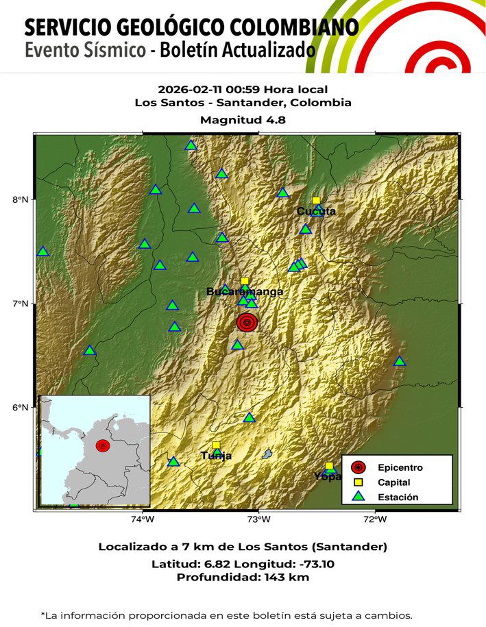 En la madrugada de este miércoles 11 de febrero, el Servicio Geológico Colombiano reportó tres temblores en el país, uno de ellos de magnitud 4.8. Los movimientos se registraron entre las 12:59 a. m. y las 4:25 a. m., con epicentros en los departamentos de Santander y Chocó.